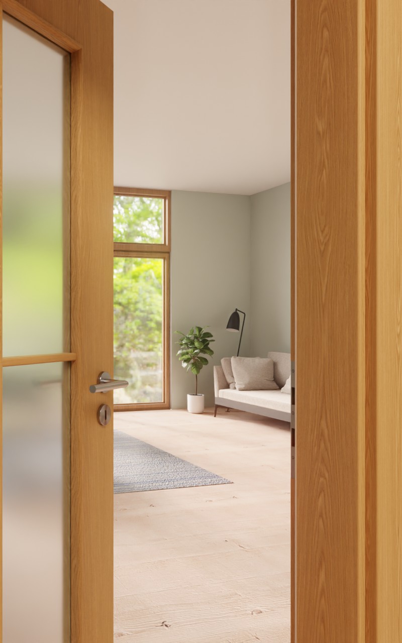 Oprócz ciepłego odcienia, dekor dąb premium wyróżnia się autentycznym wzorem, który manifestuje się w liniach słojów i dziurach po gałęziach. Ciemne pomieszczenia stają się jaśniejsze i bardziej przyjazne dzięki szklanym wstawkom z ramą przeszkloną.