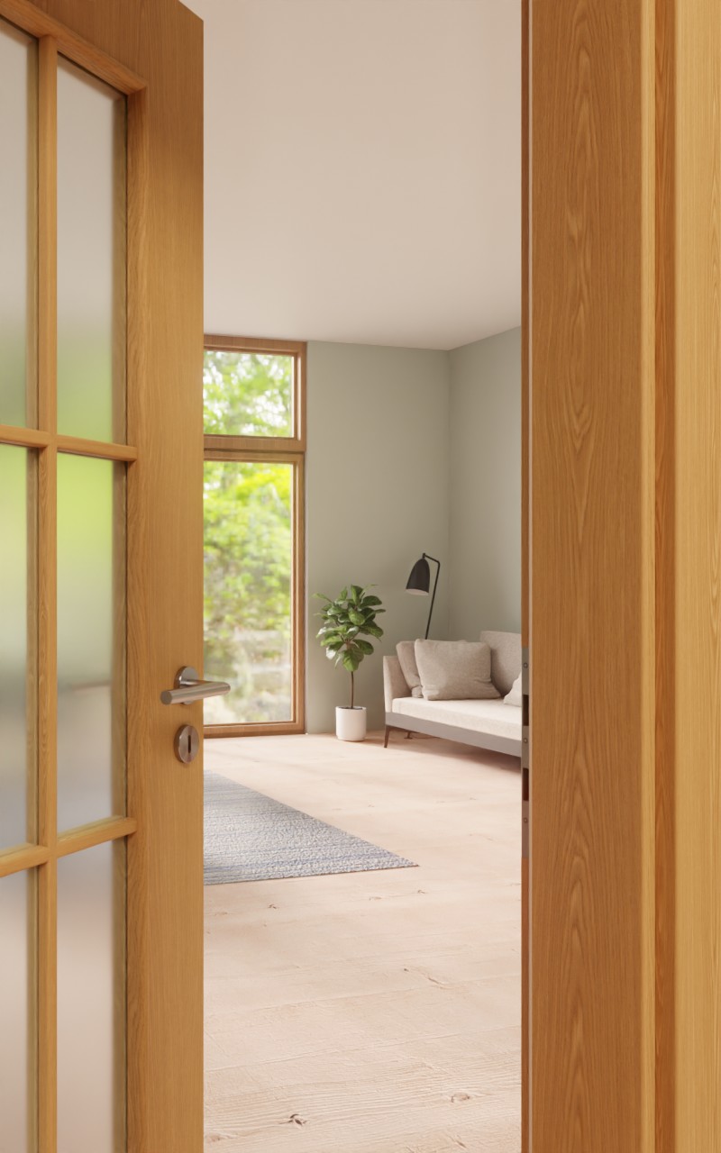 Dekor Premium Dąb z liniami słojów i dziurkami po gałęziach wprowadza przytulność i ciepło do Twojego domu. Pomieszczeniom bez okien sprzyja duże przeszklenie z ramą z przegrodami, które wpuszcza światło z sąsiedniego pomieszczenia.
