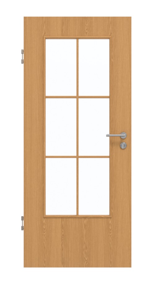 Wykończenie dąb premium zachwyca nie tylko ciepłym odcieniem, ale także autentycznym wzorem z liniami rocznymi i sękami. Dzięki eleganckiej ramie z przeszkleń duże, prostokątne przeszklenie jest podzielone na sześć mniejszych prostokątów.