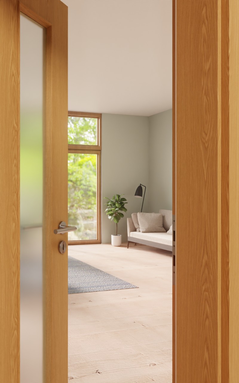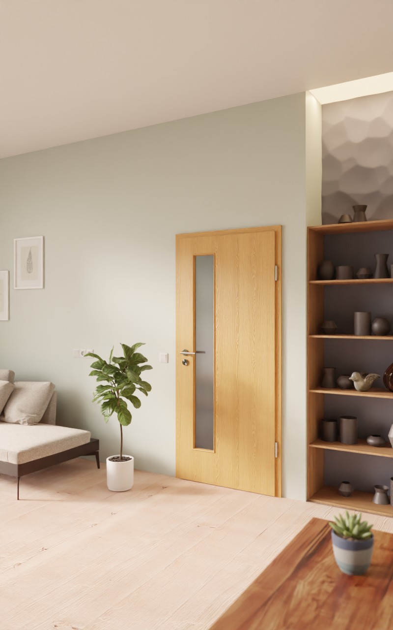 Odporne na uderzenia drzwi wewnętrzne w dekorze HPL dąb premium z atrakcyjnym przeszkleniem: