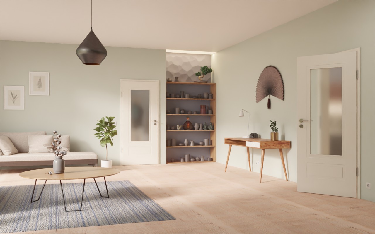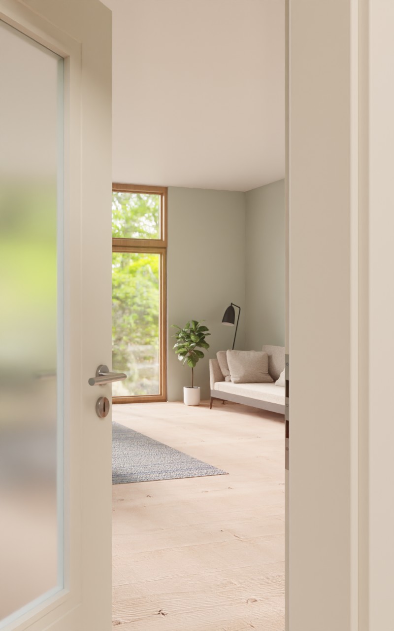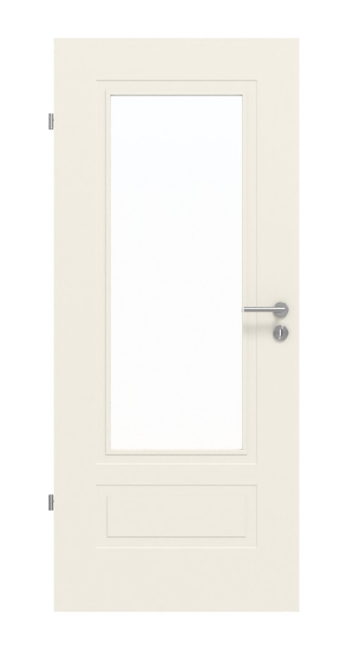 Wyrazista wewnętrzna drzwi z lakierem białym utwardzonym UV i rdzeniem z płyty wiórowej: