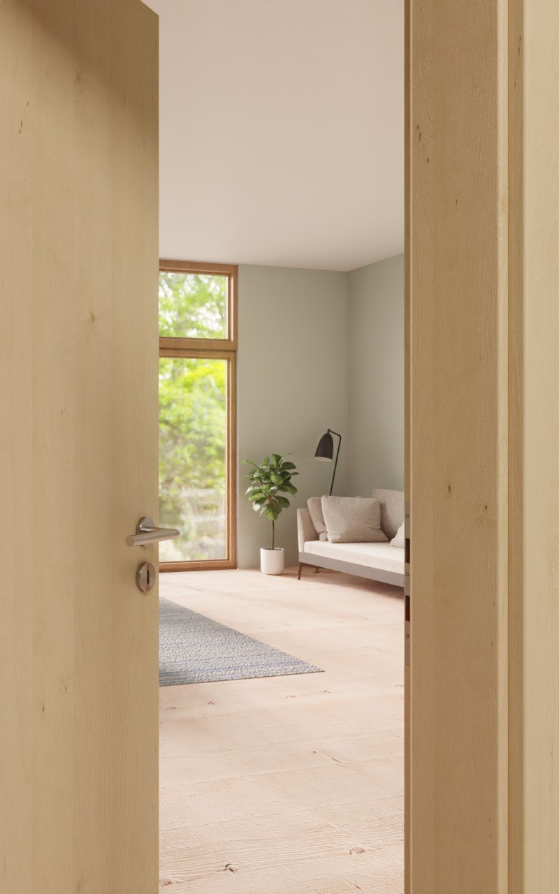 Skrzydło drzwiowe ma grubość 40 mm i jest wyposażone w stabilizującą ramę MDF oraz płytę wiórową pełną w rdzeniu. Niezawodna powłoka powierzchniowa na krawędziach skrzydła drzwiowego sprawia, że uderzenia nie stanowią żadnego problemu.