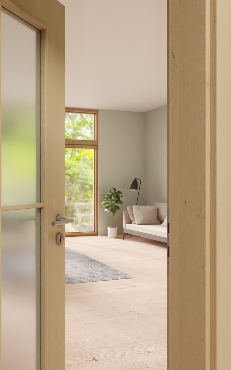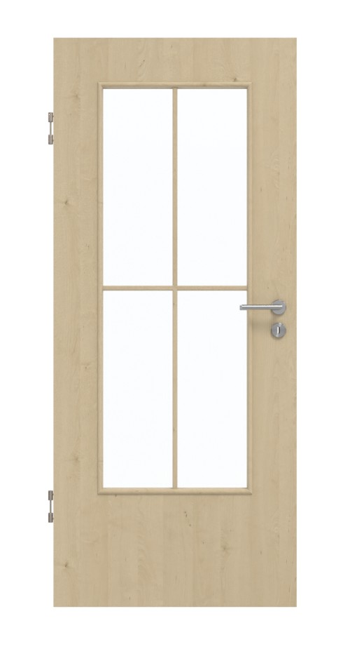 Beżowy wzór Natura Ahorn charakteryzuje się wzorem, który realistycznie imituje sęki i słoje drzewa. Duże wycięcie na szybę, podzielone eleganckimi szprosami na cztery równe pola, zapewnia doskonały dostęp światła do pomieszczeń.
