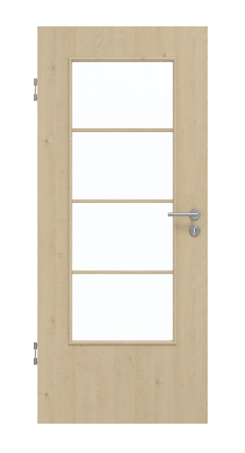 W kolorze beżowym dekor Natura Ahorn prezentuje wzór, który realistycznie imituje sęki i słoje drzewa. Drzwi zyskują nowoczesny wygląd dzięki dużemu przeszkleniu, które jest harmonijnie podzielone pionowymi szprosami.