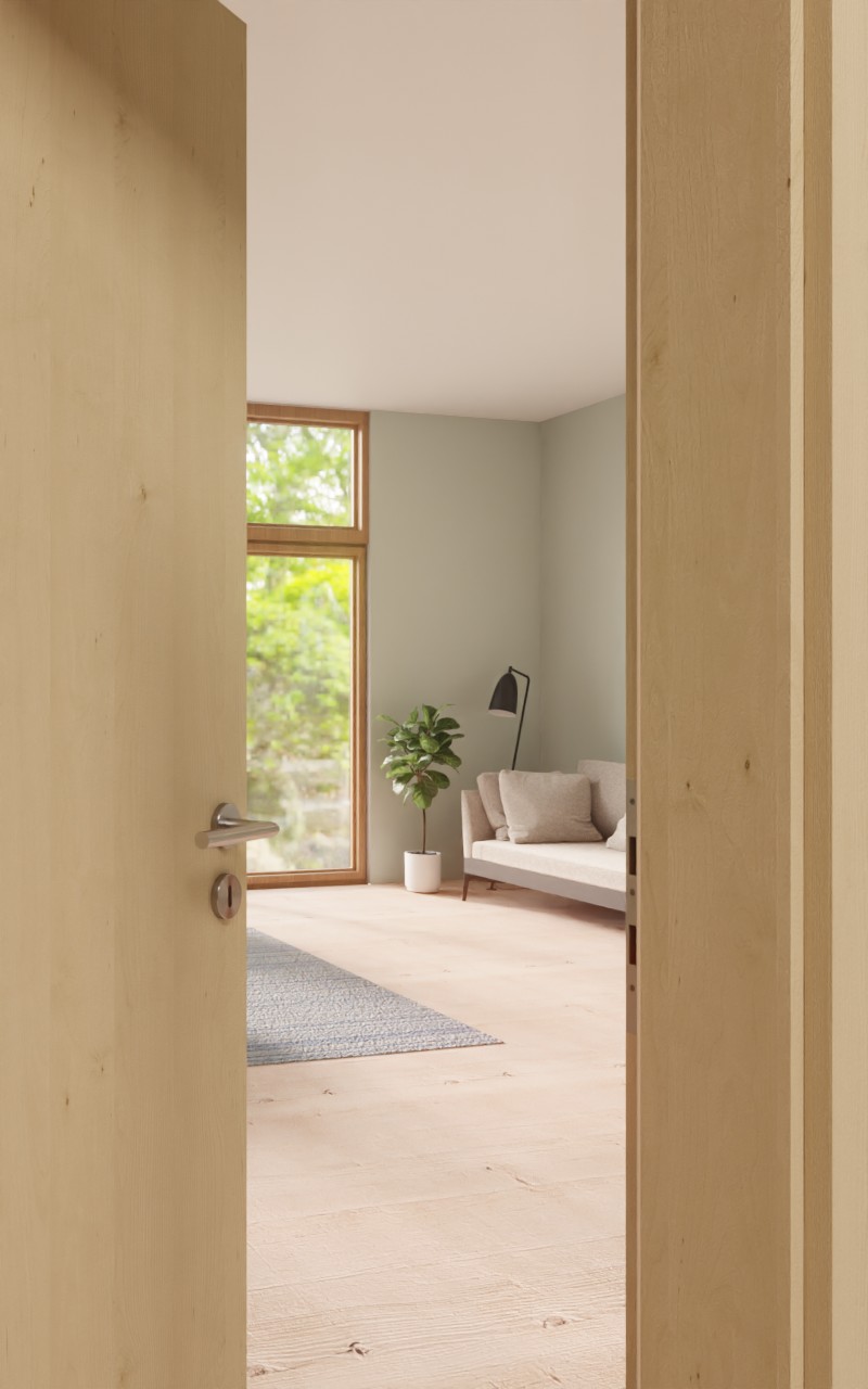 Zapraszające drzwi pokojowe w dekorze HPL Natura Klon z stylowym przeszkleniem: