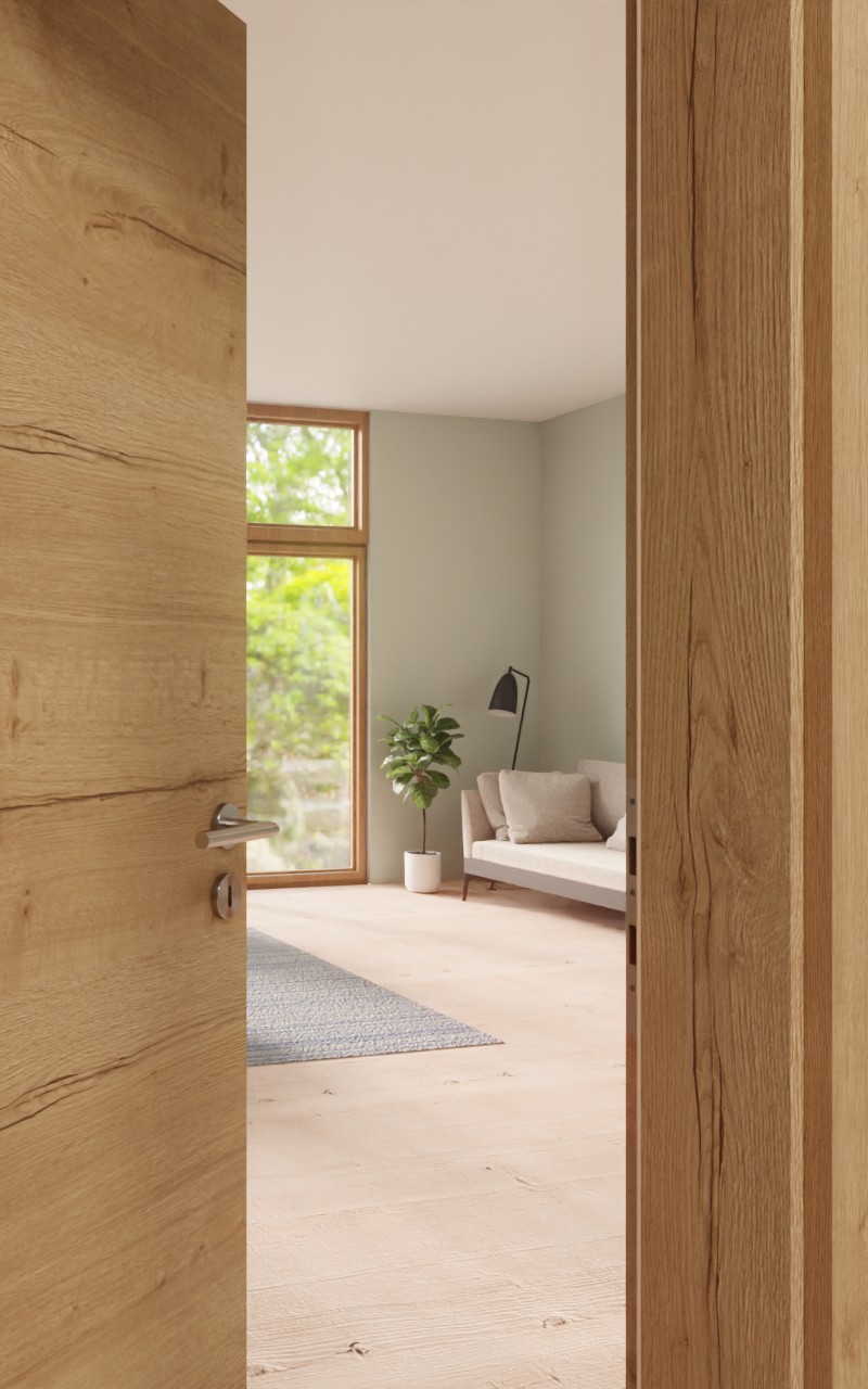 Atrakcyjne drzwi pokojowe w dekorze HPL Quer Authentic Risseiche z pięknym przeszkleniem:
