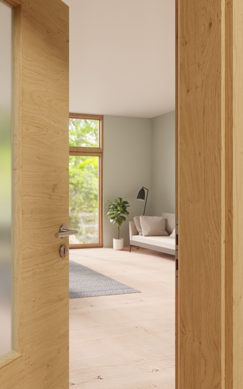 Praktyczne drzwi wewnętrzne w dekorze HPL w poziomie Authentic Asteiche z eleganckim przeszkleniem:
