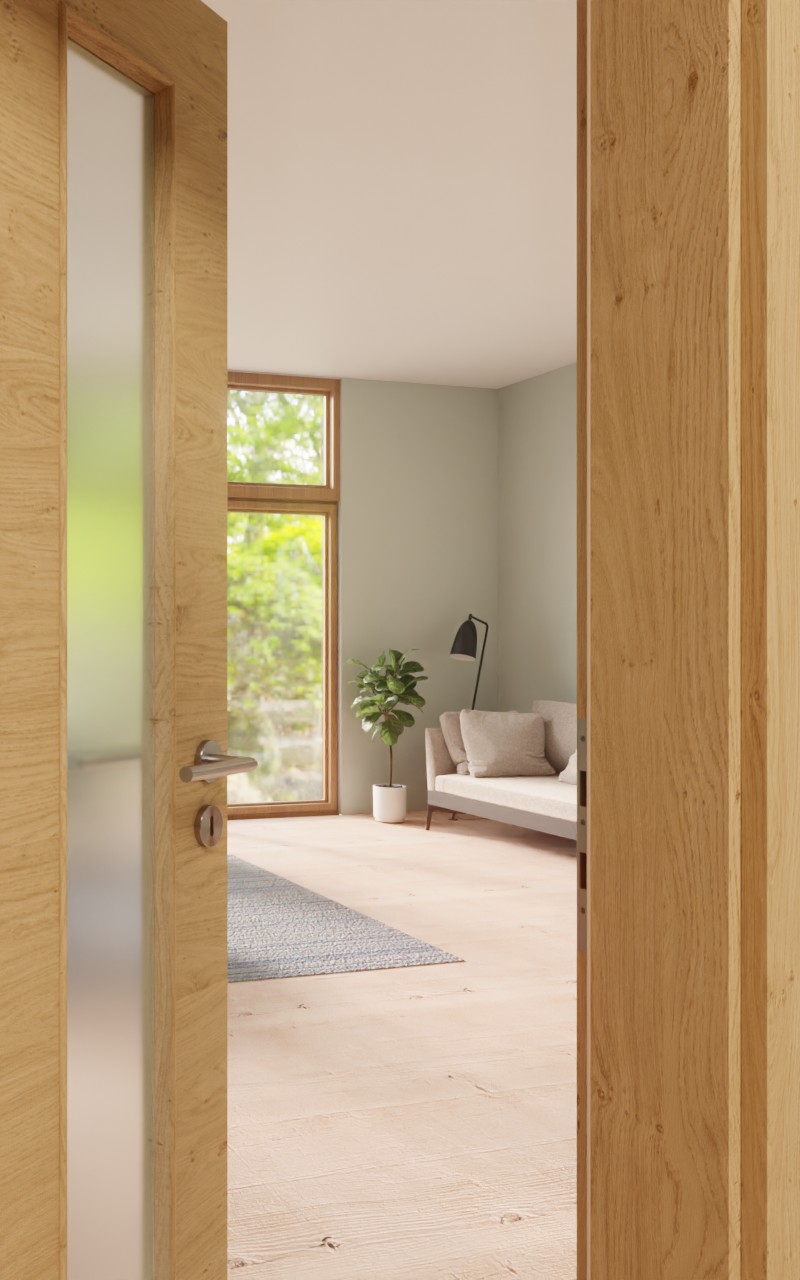 Praktyczne drzwi wewnętrzne w dekorze HPL w poziomej strukturze dębu autentycznego z eleganckim przeszkleniem:
