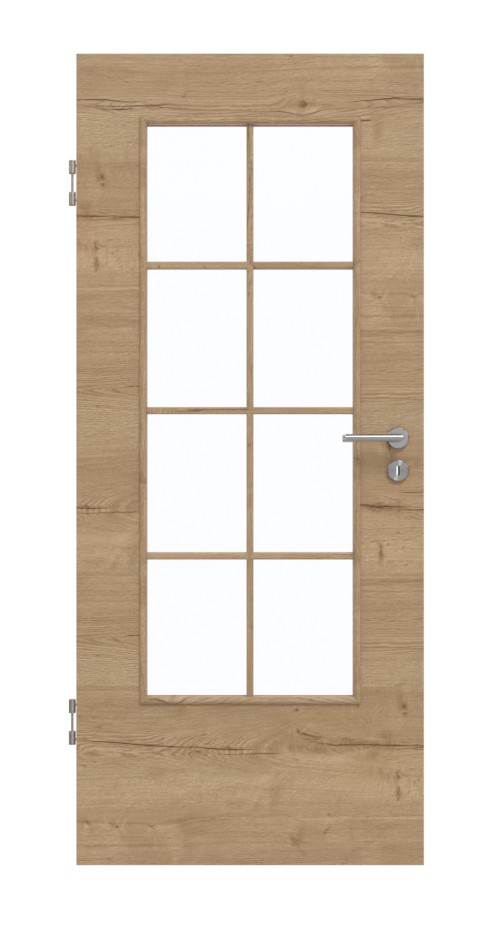 Dzięki wyraźnie widocznym liniom rocznym i sękom na dekorze autentyczna dębowa rysunkowa pozioma powstaje naturalny wygląd, który podkreśla ciemno-brązowy odcień. Pomieszczenie staje się przyjemnie jasne dzięki centralnie umieszczonemu wycięciu na światło. Nałożone listwy dzielą duży prostokąt na osiem mniejszych.