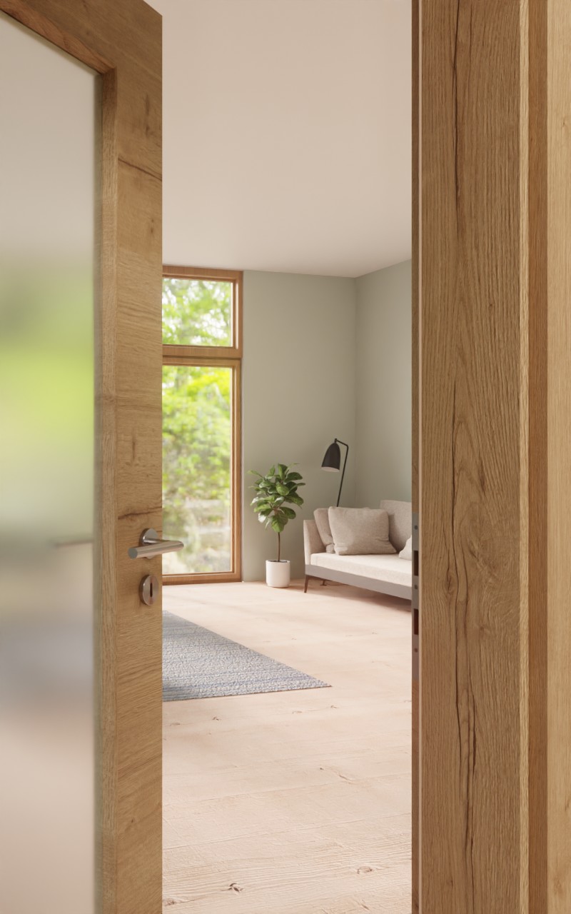 Ponadczasowe drzwi wewnętrzne w dekorze HPL w poziomie Authentic Risseiche z pięknym przeszkleniem: