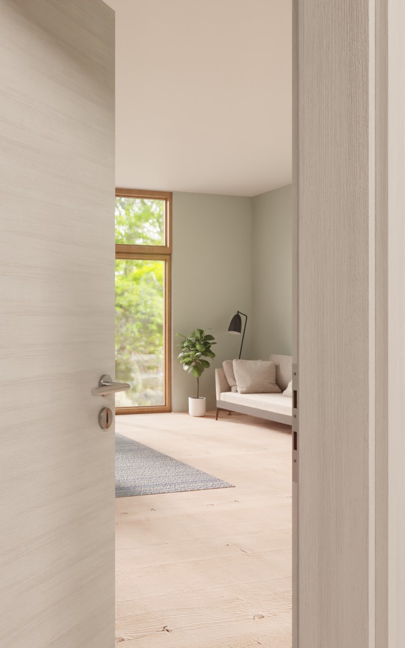 Praktyczne drzwi wewnętrzne w dekorze HPL Quer Authentic Grigio z eleganckim przeszkleniem: