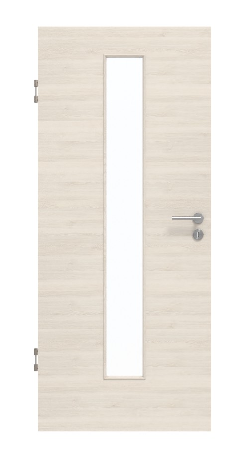 Wąskie przeszklenie sprawia, że drzwi prezentują się dekoracyjnie. Ponadto otwór pozwala na piękny dopływ światła do pomieszczenia. Kremowy dekor Authentic Pearl Quer charakteryzuje się delikatnymi liniami, które tworzą subtelny efekt drewna. Laminat HPL jest odporny na duże obciążenia i łatwy w pielęgnacji.