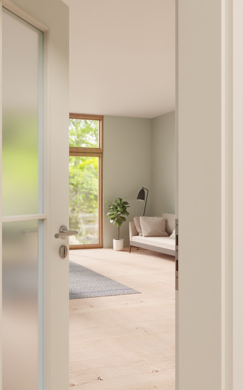 Prosta rama z poprzeczkami dzieli szklany wycięty fragment na cztery prostokąty o jednakowych wymiarach. Białe drzwi pokojowe charakteryzują się prostym wzornictwem. Odcień „kryształowa biel” jest jasny i promienny i pasuje do każdego wystroju wnętrza. Łatwa w pielęgnacji warstwa wierzchnia z HPL wyróżnia się również wysoką wytrzymałością.