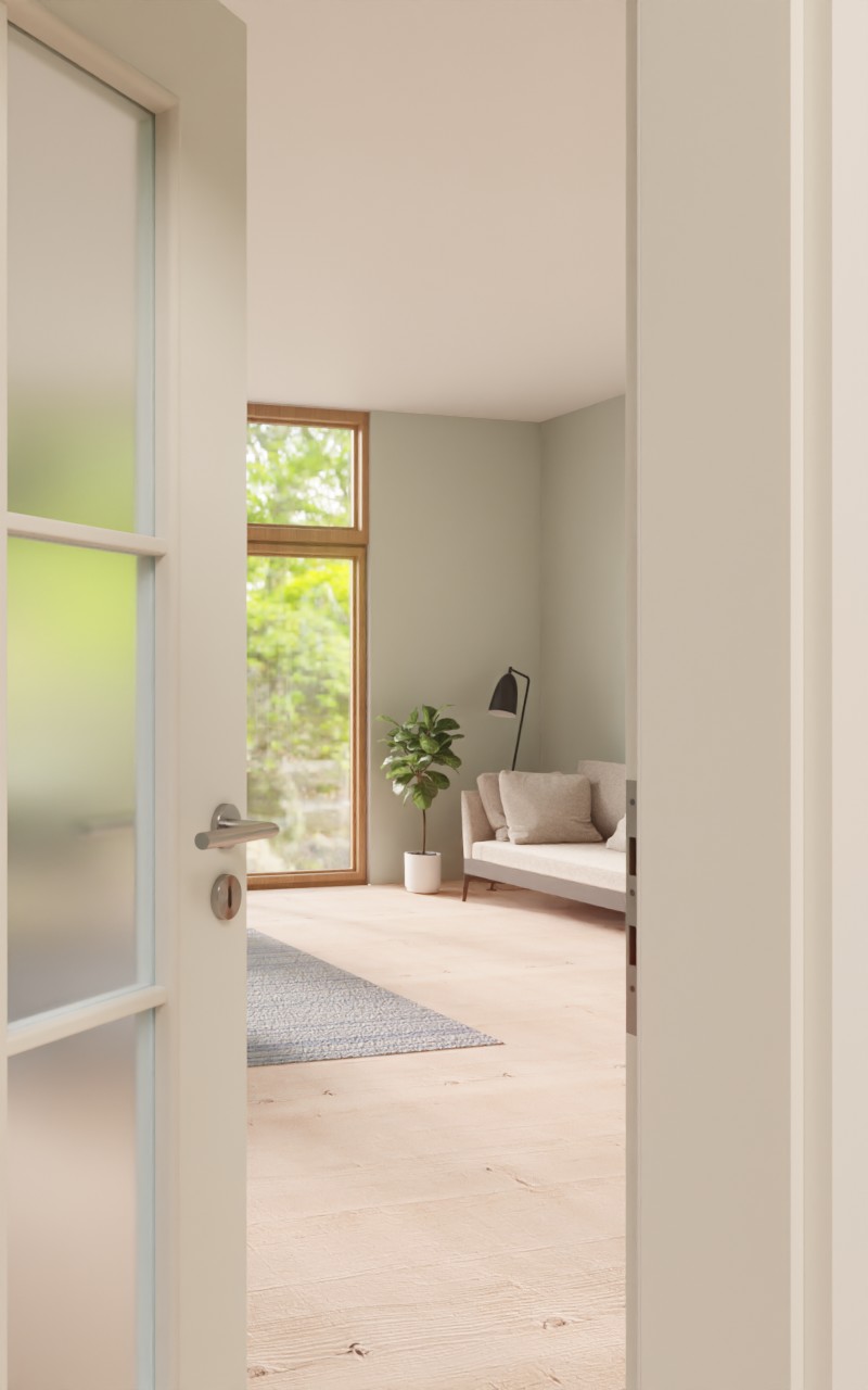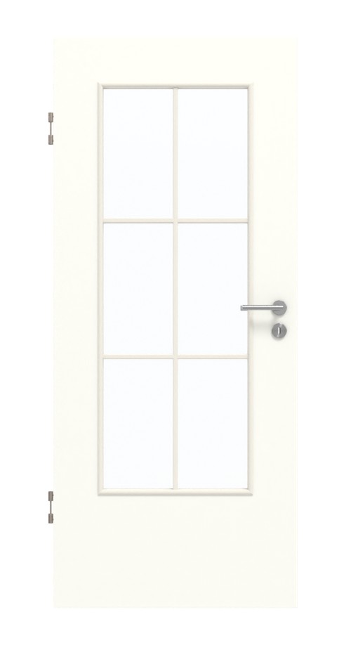 Proste linie nadają kształt dużemu otworowi okiennemu oraz delikatnej ramie z szprosami. Dzieli szybę na sześć mniejszych pól. Białe drzwi pokojowe charakteryzują się prostym wzornictwem. Odcień „kryształowa biel” jest jasny i promienny i pasuje do każdego wystroju wnętrza. Ponadto powierzchnia z płyty HPL wyróżnia się wysoką wytrzymałością oraz nowoczesną łatwością pielęgnacji.