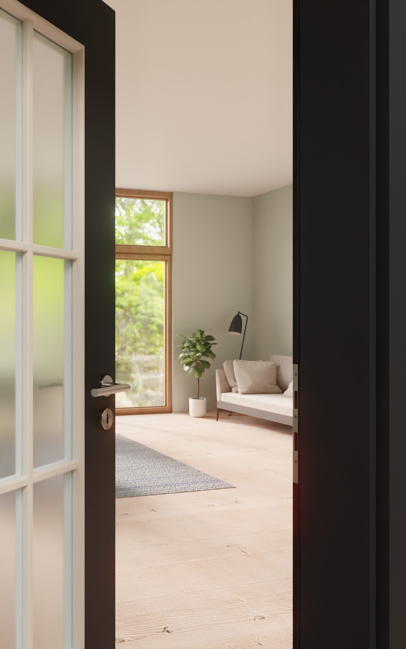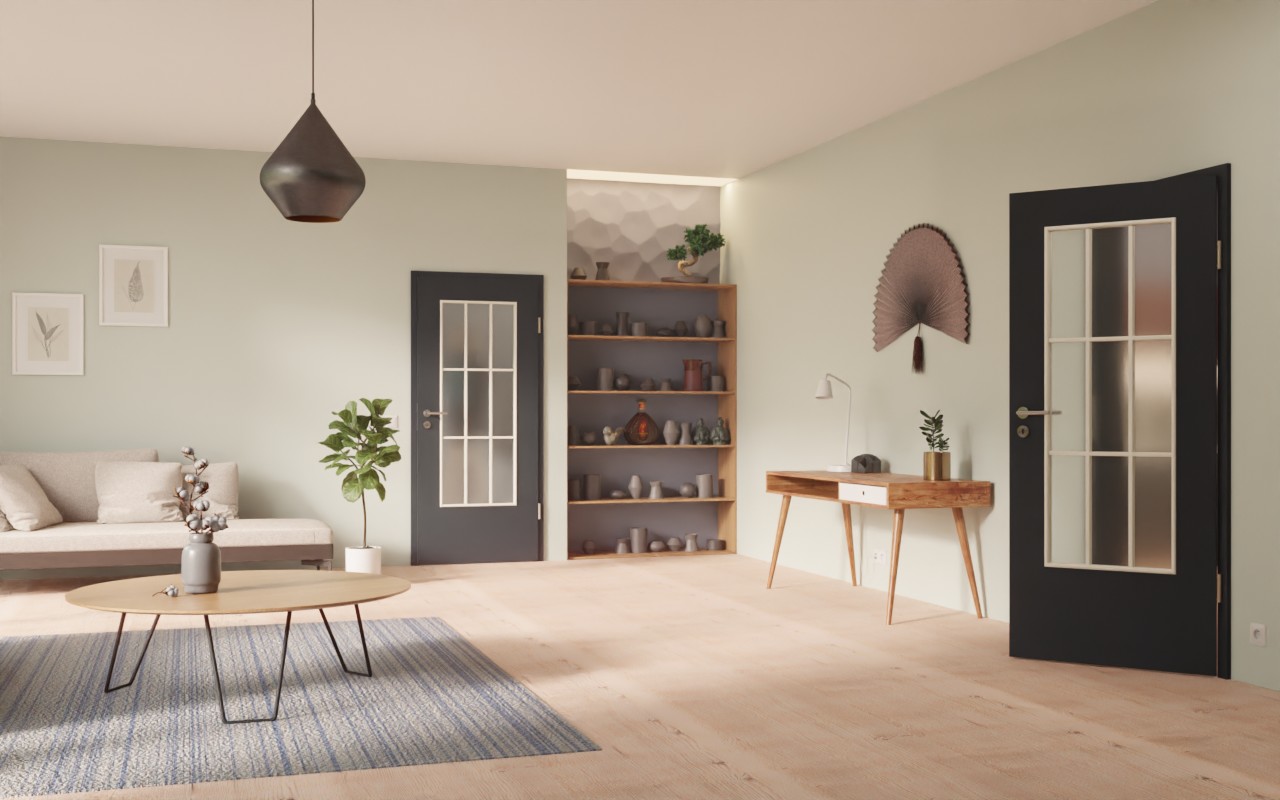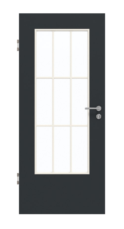 Rama z szprosami elegancko dzieli szklany panel na równe pola. Dodatkowe światło jest szczególnie korzystne w ciemnych pomieszczeniach. Te drzwi wewnętrzne wyróżniają się elegancją dzięki czarnej powierzchni. Dzięki eleganckiej kolorystyce ten model drzwi stanowi gustowny akcent w wystroju wnętrz. Odporność na zarysowania i ścieranie to dodatkowe zalety łatwego w pielęgnacji laminatu HPL.