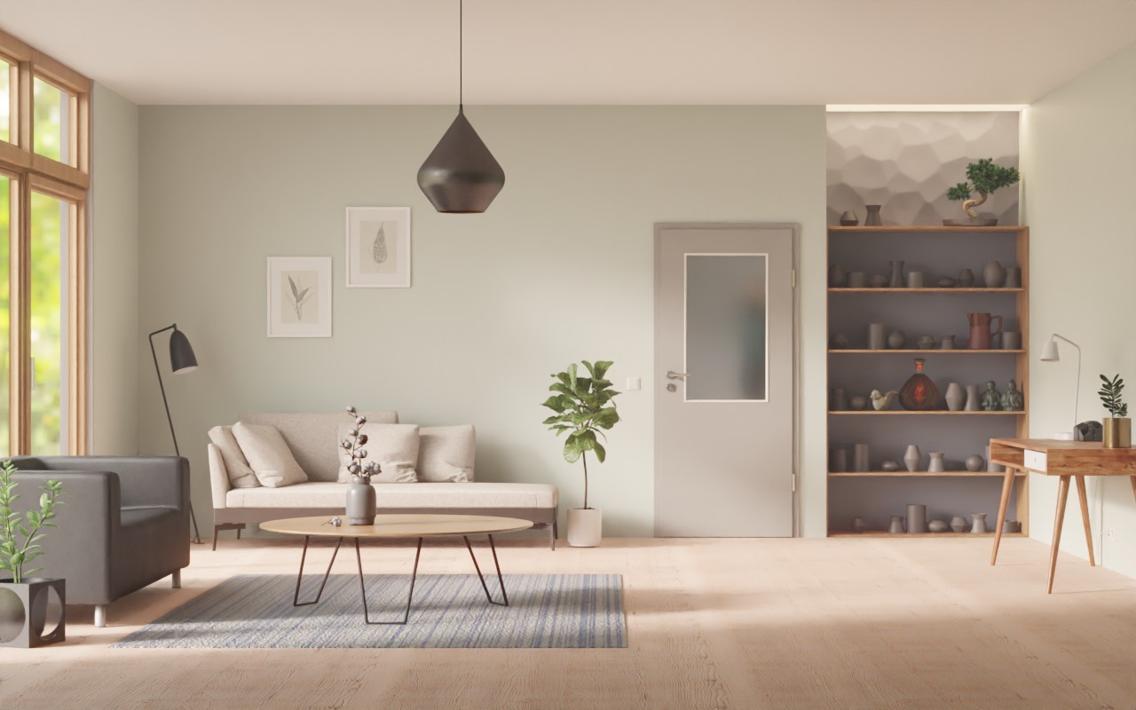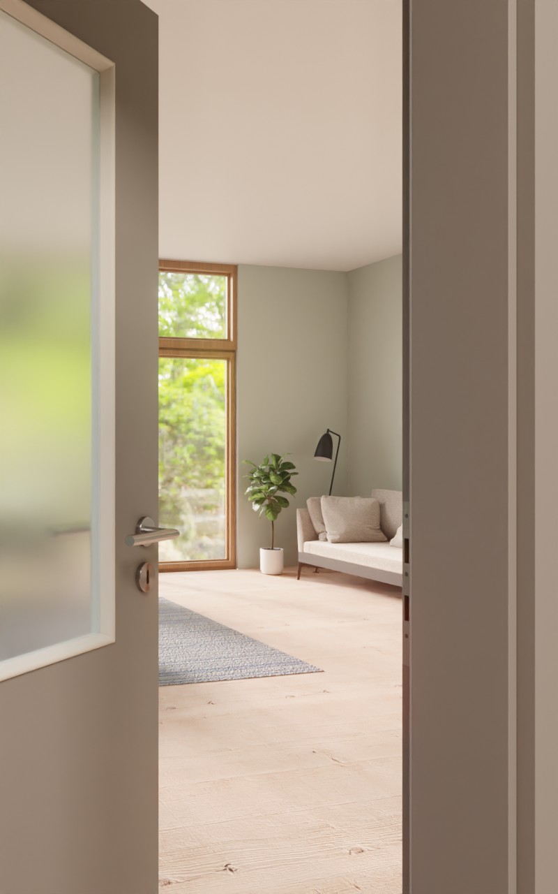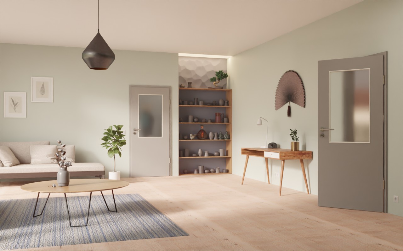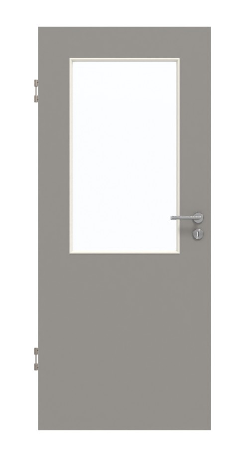 Zapraszające drzwi pokojowe w dekorze HPL U12115SD Platingrau z atrakcyjnym przeszkleniem: