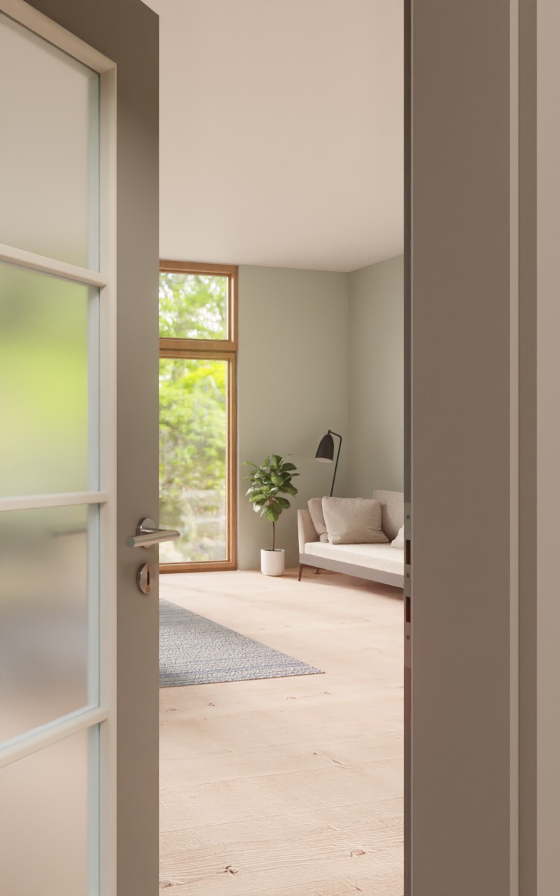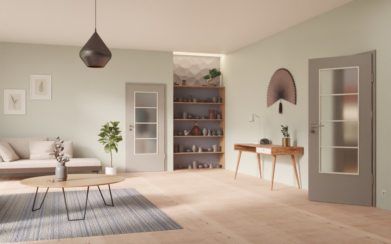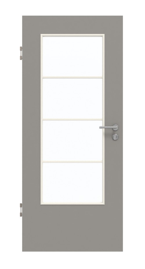 Trzy pionowe pręty równomiernie dzielą duży otwór okienny . Model drzwi wewnętrznych w kolorze szarym wyróżnia się neutralnym wyglądem. Ten nowoczesny odcień prezentuje się subtelnie. Odporność na zarysowania i ścieranie to dodatkowe zalety łatwego w pielęgnacji laminatu HPL .
