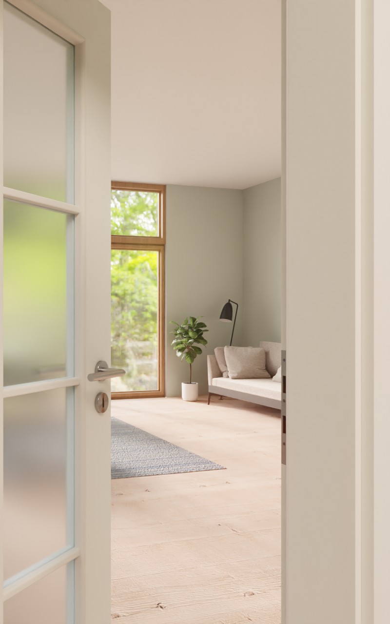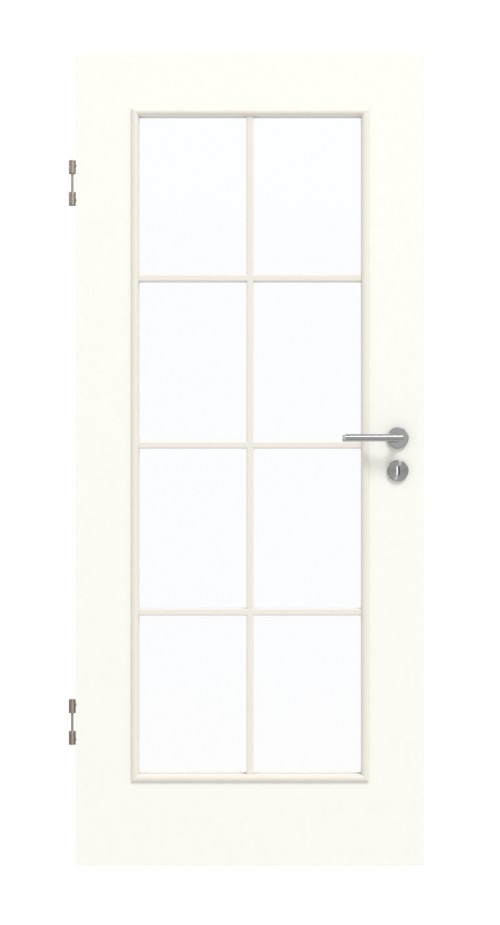 Duży szklany element zapewnia jasność w pomieszczeniu. Cienkie pręty dzielą go wizualnie na osiem równych prostokątów. Ten model drzwi wewnętrznych wyróżnia się klasycznym wzornictwem. Dzięki białej powierzchni drzwi pasują do każdego stylu wnętrza. Powierzchnia HPL jest odporna na intensywne użytkowanie i łatwa w czyszczeniu.