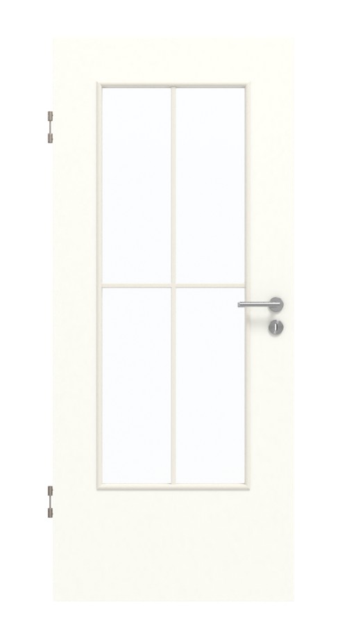 Ze względu na swoje wymiary prostokątny otwór okienny sprawdza się szczególnie dobrze w korytarzach bez okien. Jest on harmonijnie podkreślony przez nałożoną ramkę z prętów. Ten model drzwi wewnętrznych wyróżnia się klasycznym wzornictwem. Dzięki białej powierzchni drzwi pasują do każdego stylu wnętrza. Ponadto płyta laminowana HPL jest bardzo wytrzymała i łatwa w pielęgnacji.