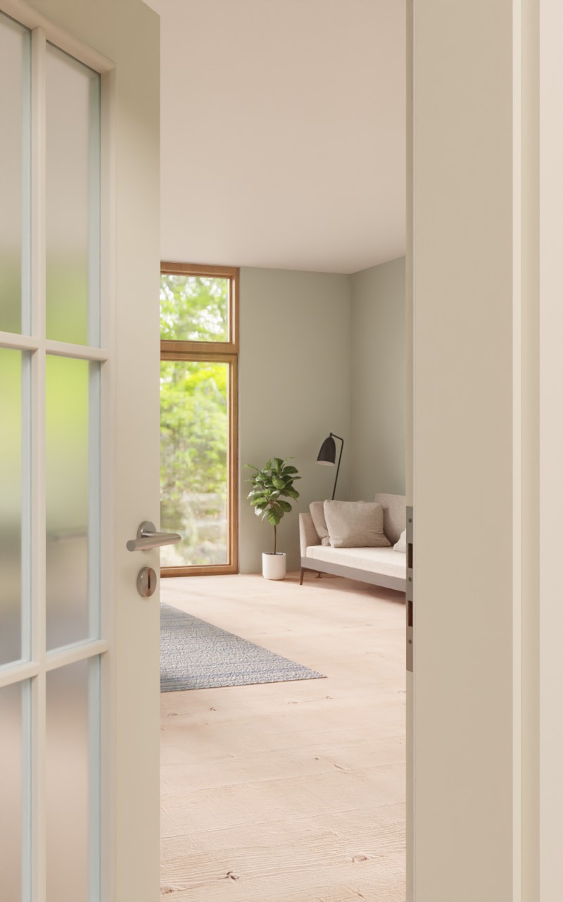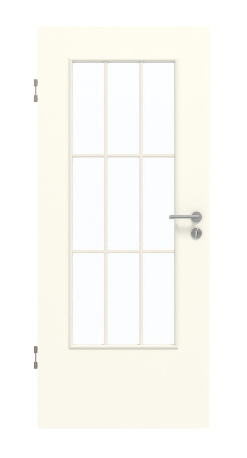Rama z szprosami elegancko dzieli duży przeszklony fragment na równe prostokąty. Dodatkowe światło jest szczególnie korzystne w ciemnych pomieszczeniach. Białe drzwi wewnętrzne z łatwością komponują się z każdym otoczeniem. Powierzchnia w kolorze platynowej bieli nadaje drzwiom ponadczasowy charakter. Laminat HPL jest łatwy w czyszczeniu i wytrzymuje duże obciążenia.
