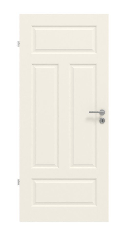 Na skrzydle drzwiowym znajdują się cztery wąskie wypełnienia. Matowe lakierowanie dostępne jest w odcieniach bieli RAL 9010 lub 9016, według życzenia. Nakładane jest w przyjaznym dla środowiska procesie, co zapewnia jednolitą optykę i przyjemną w dotyku powierzchnię. Dodatkowo wielowarstwowe lakierowanie dzięki utwardzaniu UV jest odporne na brud i zarysowania.