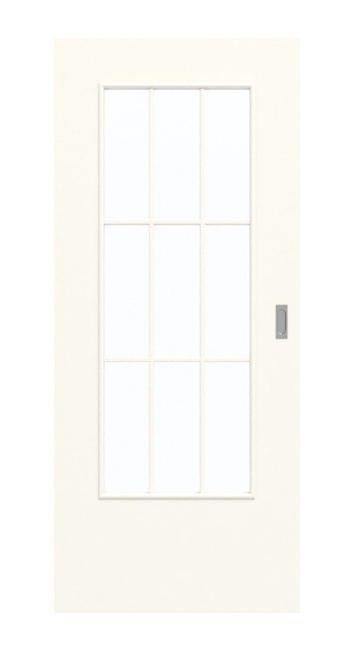 Umieszczone pośrodku przeszklenie zapewnia jasność i przyjazną atmosferę w pokoju. Nałożone szprosy stanowią elegancki element stylistyczny i dzielą szkło na dziewięć równych pól. Drzwi przesuwne w stonowanym kolorze Pearl White zachwycają ponadczasową elegancją. Jasny odcień można połączyć z każdym wystrojem wnętrza. Stabilna i wytrzymała powierzchnia z CPL jest odporna na obciążenia mechaniczne.