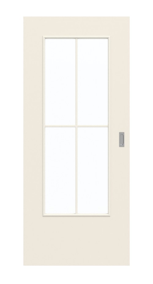 W środkowej części skrzydła drzwiowego znajduje się duże wycięcie na szybę. Dzięki przepuszczalnemu materiałowi do pomieszczeń wpada dużo światła. Prosta rama szprosowa dzieli szkło na cztery równe części. Jasne drzwi przesuwne w kolorze Dawn sprawiają wrażenie dyskretnych i spokojnych. Szaro-biała powierzchnia tworzy spokojną atmosferę. Powierzchnia wykonana z HPL jest odporna na zabrudzenia i obciążenia mechaniczne.