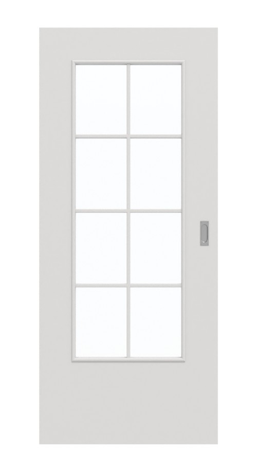 Szklana wstawka w środkowej części skrzydła drzwiowego daje gwarancję jasnego i przyjaznego klimatu wnętrza. Drobne szprosy dzielą je optycznie na osiem równych prostokątów. Design drzwi przesuwnych charakteryzuje się równowagą. Szary odcień Silver Grey spokojnie komponuje się z nowoczesnym wystrojem wnętrz. Zarysowania i zużycie mechaniczne nie mają prawie żadnego wpływu na powierzchnię CPL.