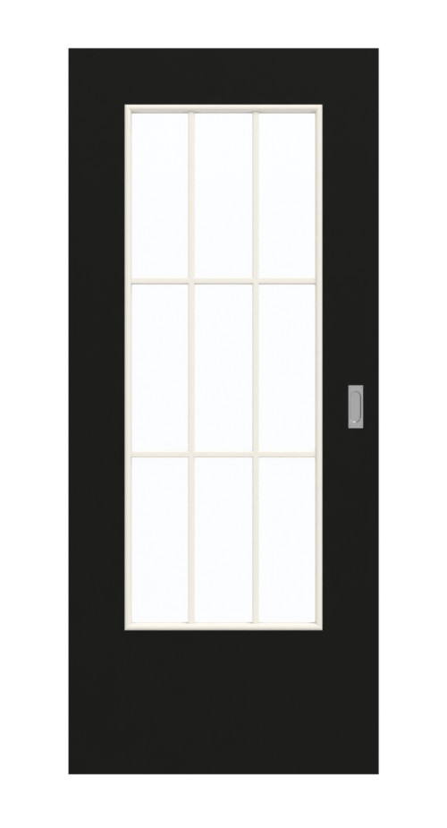 Duże przeszklenie umieszczone pośrodku skrzydła drzwiowego zapewnia jasne wnętrze. Jest ono podzielone na dziewięć równych pól za pomocą eleganckiej ramy z prętami. Czarne drzwi przesuwne emanują nowoczesną elegancją. Ciemny odcień można łączyć na wiele sposobów. Łatwa w pielęgnacji warstwa wierzchnia z HPL jest odporna na czynniki zewnętrzne, takie jak ciepło, światło i obciążenia mechaniczne.