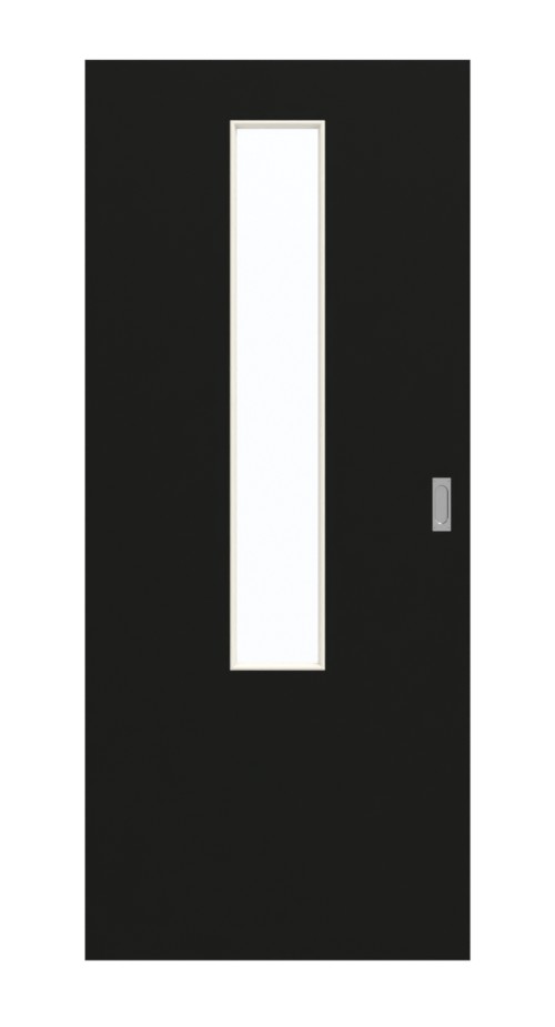 W górnej części drzwi na środku wycięto wąski otwór. Podłużne przeszklenie zapewnia jasną atmosferę w pomieszczeniu. Czarne drzwi przesuwne emanują nowoczesną elegancją. Ciemny odcień można łączyć na wiele sposobów. Powierzchnia HPL jest odporna na zarysowania i ścieranie.