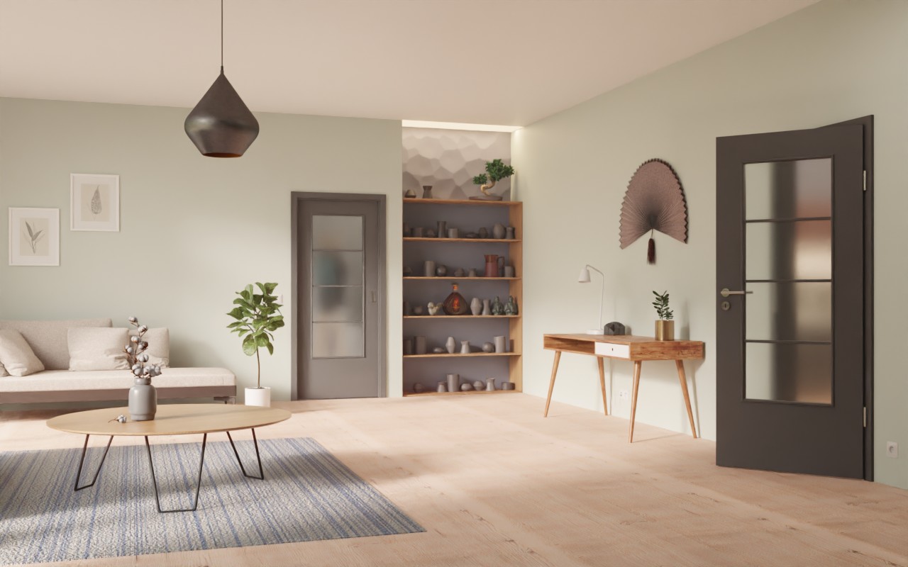 Przeszklenie na środku skrzydła drzwiowego zapewniające jasność i przyjazną atmosferę we wnętrzu. Pionowe szprosy nadają drzwiom nowoczesny i prosty wygląd. Drzwi przesuwne w nowoczesnym kolorze Ebony zachwycają modnym designem. Powierzchnia w stonowanym szarym kolorze zachwyca swoją elastycznością. Wytrzymały materiał powierzchniowy CPL jest odporny na zużycie mechaniczne.