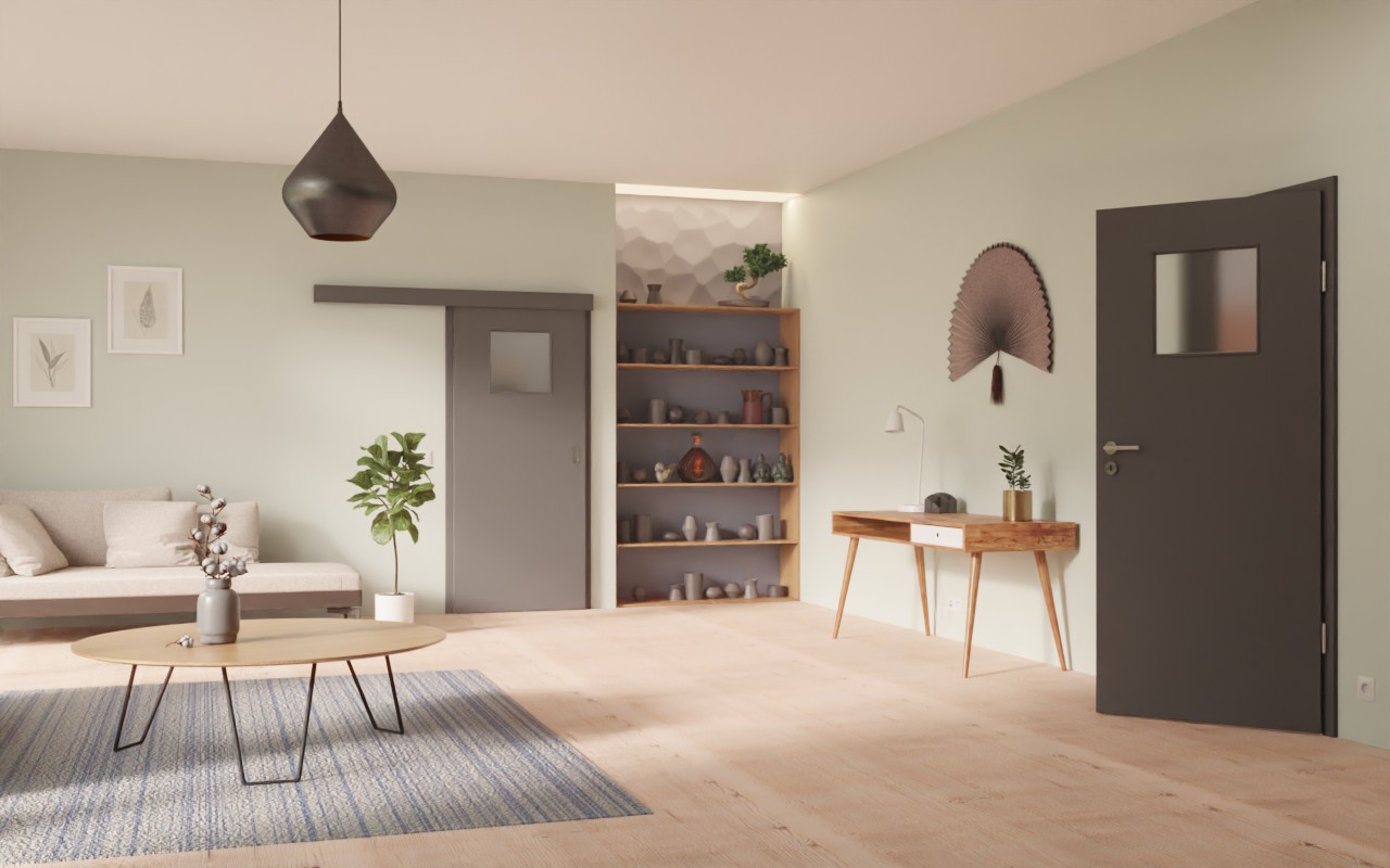 Dzięki skrzydłu drzwiowemu, którego głównym elementem stylistycznym jest kwadratowe przeszklenie na wysokości oczu, do pomieszczeń wpada jasność i przejrzystość. Spokojna elegancja charakteryzuje drzwi przesuwne w modnym kolorze Ebony. Szary kolor można łączyć w różnorodne sposoby. Wytrzymały materiał powierzchniowy CPL jest odporny na zużycie mechaniczne.