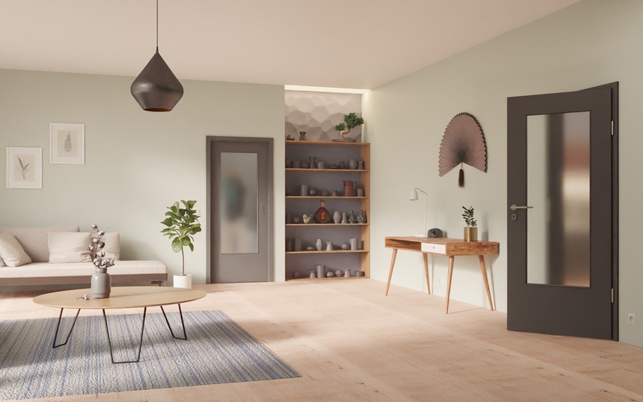 Przeszklenie w środkowej części drzwi zapewnia jasność i przyjazną atmosferę w wnętrzach. Model drzwi przesuwnych w stonowanym kolorze Ebony prezentuje się modnie. Powierzchnia w stonowanym szarym kolorze zachwyca swoją elastycznością. Wierzchnia warstwa wykonana z CPL jest odporna na zużycie mechaniczne.