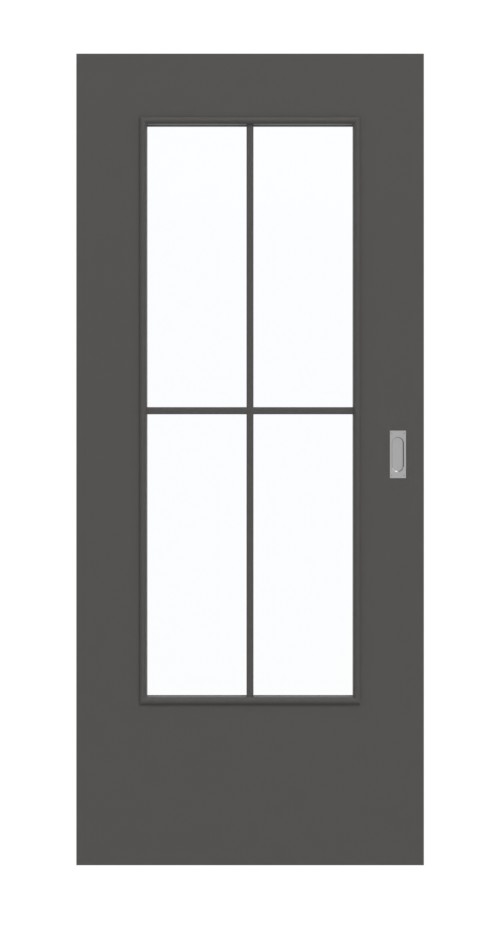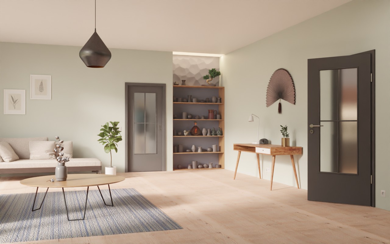 Przeszklenie w środkowej części drzwi zapewnia jasność i przyjazną atmosferę w wnętrzach. Delikatne, nakładane szprosy nadają mu piękną symetrię. Model drzwi przesuwnych w stonowanym kolorze Ebony prezentuje się modnie. Ciemna szarośćstylowo komponuje się z nowoczesnym wystrojem wnętrz. Materiał powierzchniowy wykonany z CPL jest wytrzymały i odporny na zarysowania.