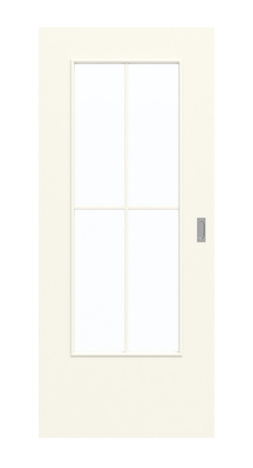 Dzięki wycięciu na szybę pośrodku skrzydła drzwiowego możesz cieszyć się jasnymi wnętrzami. Prosta rama z prętami dzieli szklenie na cztery równe prostokąty. Drzwi przesuwne białe wyróżnia się harmonijnym designem. Jasny kolor można świetnie łączyć z innymi kolorami. Wierzchnia warstwa wykonana z CPL jest odporna na zużycie mechaniczne.