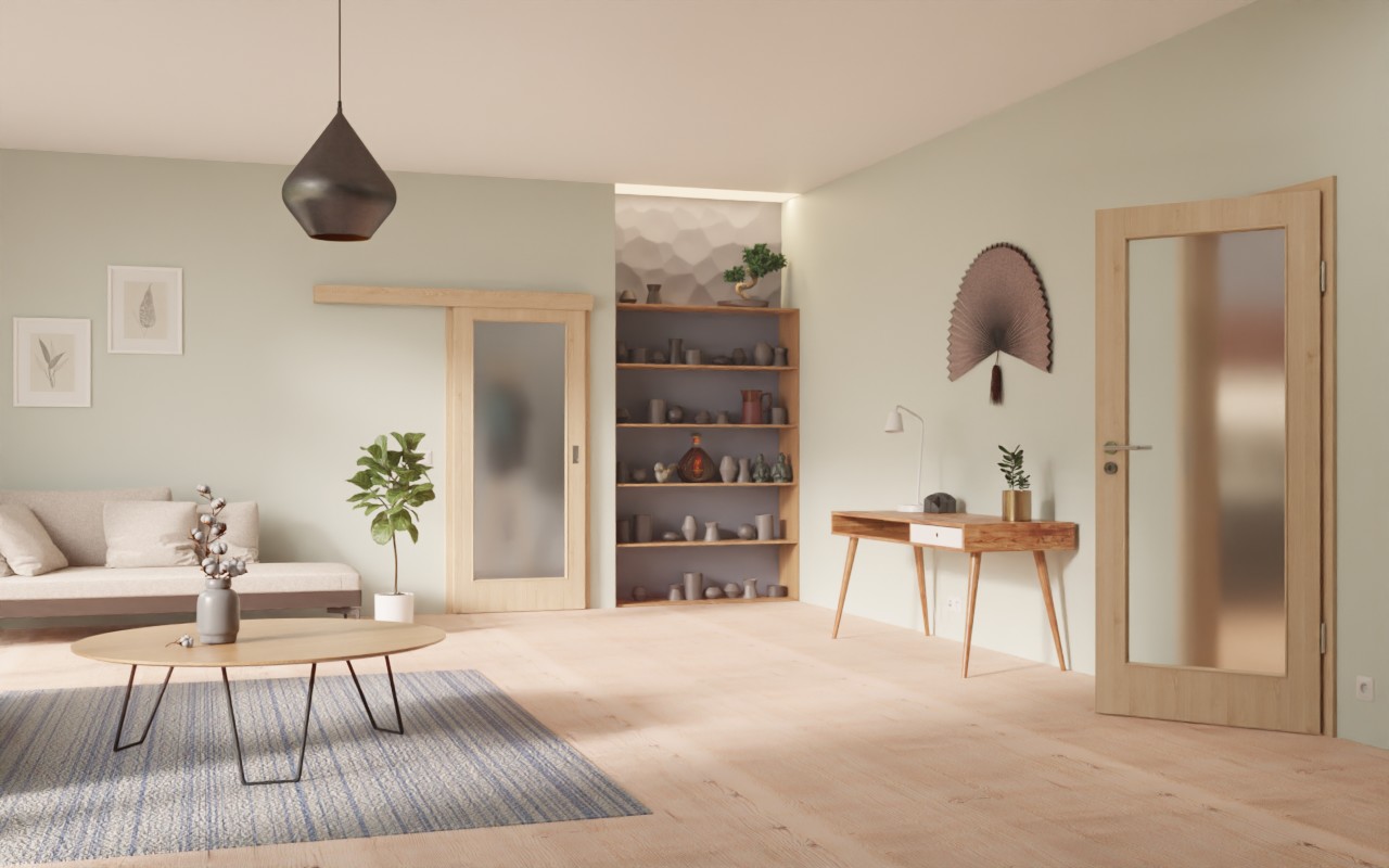 Drzwi wykonane są z płyty wiórowej pełnej. Dzięki certyfikacji w grupie obciążenia M nadaje się zarówno do użytku w biurach, jak i w domu. Prostokątny uchwyt wpuszczany muszlowy o owalnym kształcie oraz rowek prowadzący podłogowy umożliwiają płynne otwieranie i zamykanie.