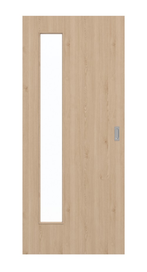 Dzięki wąskiemu wycięciu na światło po stronie zawiasów skrzydło drzwi zyskuje indywidualny charakter. Drzwi przesuwne zachwycają drobnym dekorem drewna. Delikatne słoje i subtelne sęki zdobią skrzydło drzwi. Odcinają się od ciepłego brązowego tła. Powierzchnia wykonana z CPL charakteryzuje się ogromną wytrzymałością.