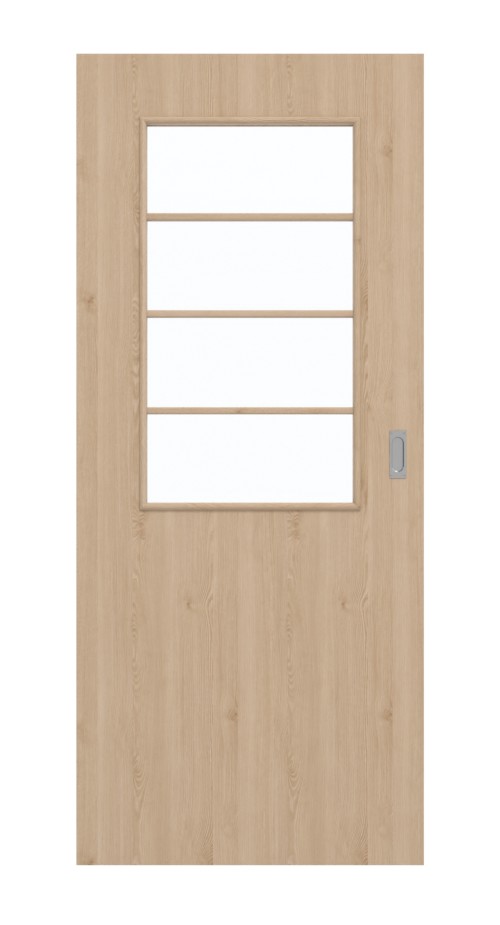 Drzwi wykonane są z płyty wiórowej pełnej. Dzięki certyfikacji w grupie obciążenia M można ją montować zarówno w biurach, jak i pomieszczeniach prywatnych. Dzięki prostokątnemu uchwytowi wpuszczanemu muszlowemu oraz rowkowi prowadzącemu w dolnej części drzwi można łatwo otwierać i zamykać.
