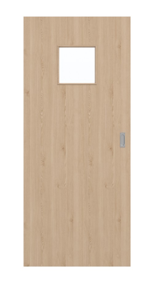 Wycięcie na szybę na wysokości oczu daje gwarancję jasności i tym samym przyjaznej atmosfery w pomieszczeniach. Drzwi przesuwne zachwycają drobnym dekorem drewna. Na całej długości skrzydła drzwiowego widoczne są delikatne usłojenia i drobne sęki. Odcinają się od ciepłego brązowego tła. Zastosowany laminat CPL wykazuje wyjątkową odporność na obciążenia mechaniczne.