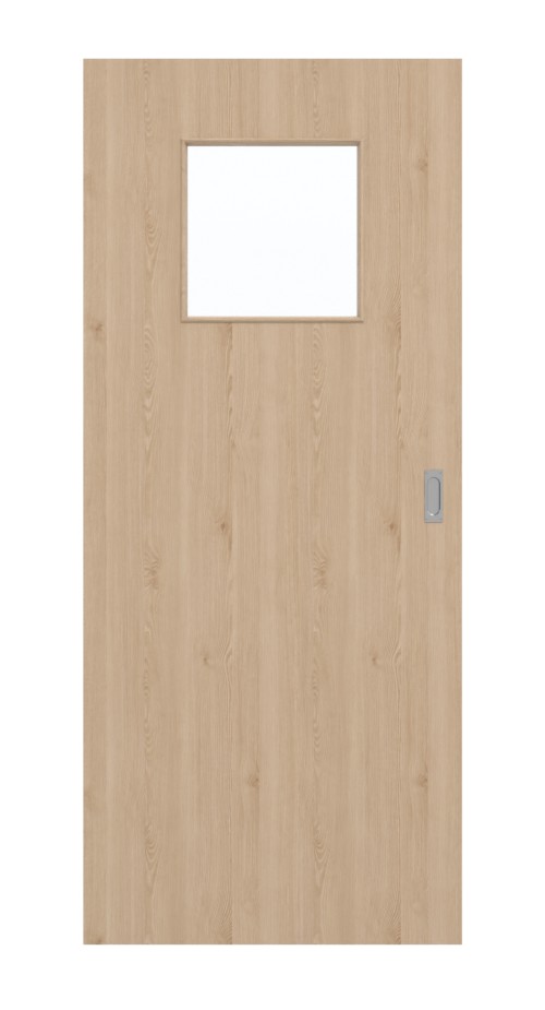 Główny element stylistyczny skrzydła drzwiowego – kwadratowy wycięty otwór w górnej części skrzydła – wnosi do pomieszczeń jasność i przejrzystość. Drzwi przesuwne zachwycają drobnym dekoremdrewna. Drobne usłojenia rozciągają się na całej długości skrzydła drzwiowego. Odcinają się od ciepłego brązowego tła. Stabilna i wytrzymała powierzchnia z CPL jest odporna na obciążenia mechaniczne.