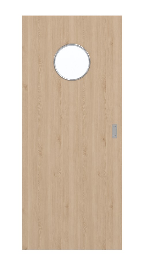 Zaokrąglone przeszklenie na wysokości oczu nadaje modelowi marynarski charakter. Model drzwi przesuwnych w wykończeniu imitującym drewno wyróżnia się delikatnym wzorem. Na całej długości skrzydła drzwiowego widoczne są delikatne usłojenia i drobne sęki. Spokojnie odcinają się od brązowego tła. Wierzchnia warstwa z HPL jest wyjątkowo odporna na obciążenia mechaniczne, światło i ciepło.