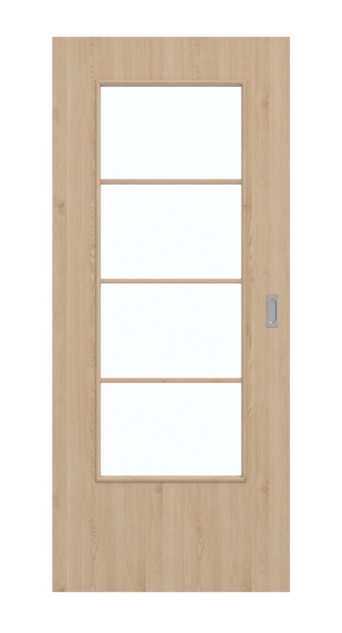 Umieszczone pośrodku przeszklenie zapewnia jasność i przyjazną atmosferę w pokoju. Dzięki poziomym szprosom drzwi sprawiają wrażenie prostych, a jednocześnie nowoczesnych. Drzwi przesuwne z dekorem drewna tworzą przyjemną atmosferę w wnętrzu. Delikatne usłojenia biegną pionowo wzdłuż skrzydła drzwiowego. Podłoże jest średnio brązowe. Stabilna i łatwa w pielęgnacji powierzchnia z HPL jest odporna na obciążenia mechaniczne i wysoką temperaturę.