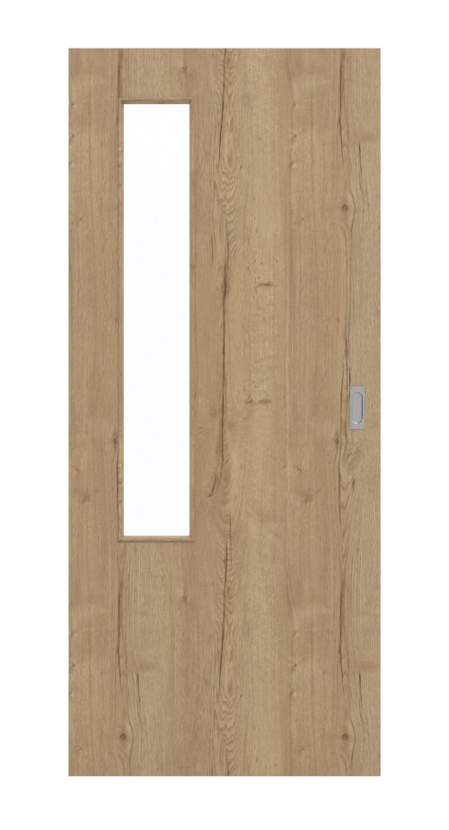 Ponieważ po stronie zawiasów w skrzydle drzwiowym znajduje się podłużny szklany wycięty element , światło przedostaje się do pomieszczeń. Dzięki wyrazistemu dekorowi dębowemu te drzwi przesuwne stanowią żywy akcent stylistyczny. Ciemne sęki i słoje wyraźnie wyróżniają się na brązowym tle. Całość wyróżnia się rustykalnym urokiem. Łatwa w pielęgnacji warstwa wierzchnia z HPL jest odporna na czynniki zewnętrzne, takie jak ciepło, światło i obciążenia mechaniczne.