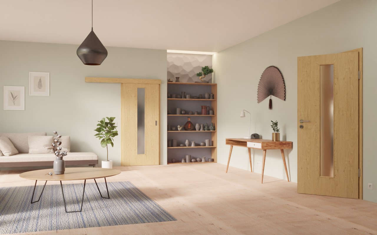 Wąskie przeszklenie umieszczone pośrodku skrzydła drzwiowego daje jasną i przyjazną atmosferę we wnętrzu. Wyraźne usłojenia i sęki stanowią charakterystyczny element wzornictwa drzwi przesuwnych. Dekor dębowy doskonale komponuje się z wystrojem Twojego wnętrza. Harmonijne, naturalne odcienie brązu są zaokrąglone i dopełniają imitację drewna. Wierzchnia warstwa wykonana z CPL jest odporna na zużycie mechaniczne.