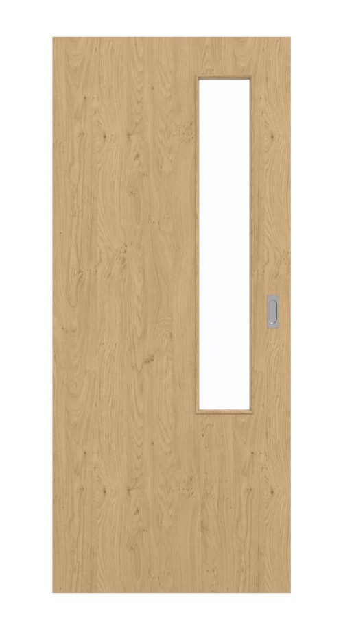 W pobliżu klamki znajduje się wąskie wycięcie na szybę. Nadaje to drzwiom indywidualny wygląd i rozjaśnia pomieszczenia. Wyraźne usłojenia i sęki stanowią charakterystyczny element wzornictwa drzwi przesuwnych. Rustykalny dekor dębowy urzeka swoim naturalnym wyglądem. Harmonijne, naturalne odcienie brązu są zaokrąglone i dopełniają imitację drewna. Wytrzymały materiał powierzchniowy CPL jest odporny na zużycie mechaniczne.