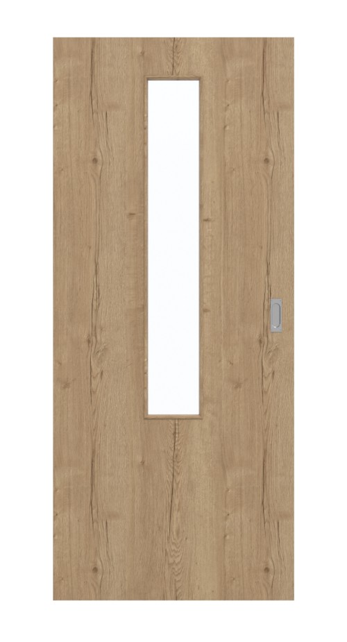 Podłużny otwór na światło w górnej części skrzydła drzwi tworzy przyjazną atmosferę w pomieszczeniu. Dzięki wyrazistemu dekorowi dębowemu te drzwi przesuwne stanowią żywy akcent stylistyczny. Na naturalnie brązowym tle wyraźnie wyróżniają się ciemne słoje i sęki. Projekt drzwi charakteryzuje się rustykalnym stylem. Trwała i łatwa w pielęgnacji okładzina z HPL dobrze znosi obciążenia mechaniczne i wysoką temperaturę.