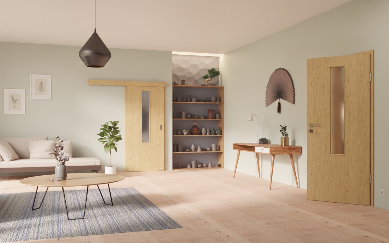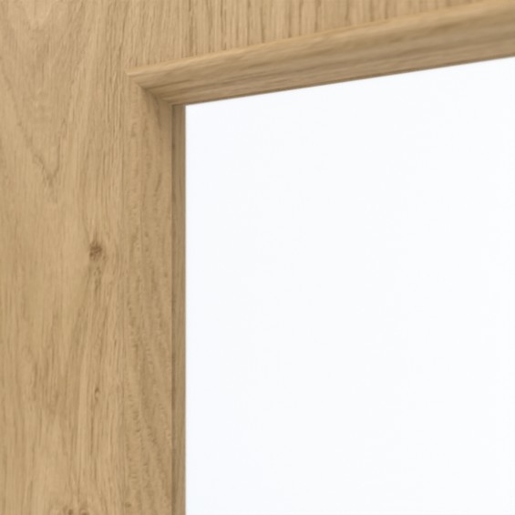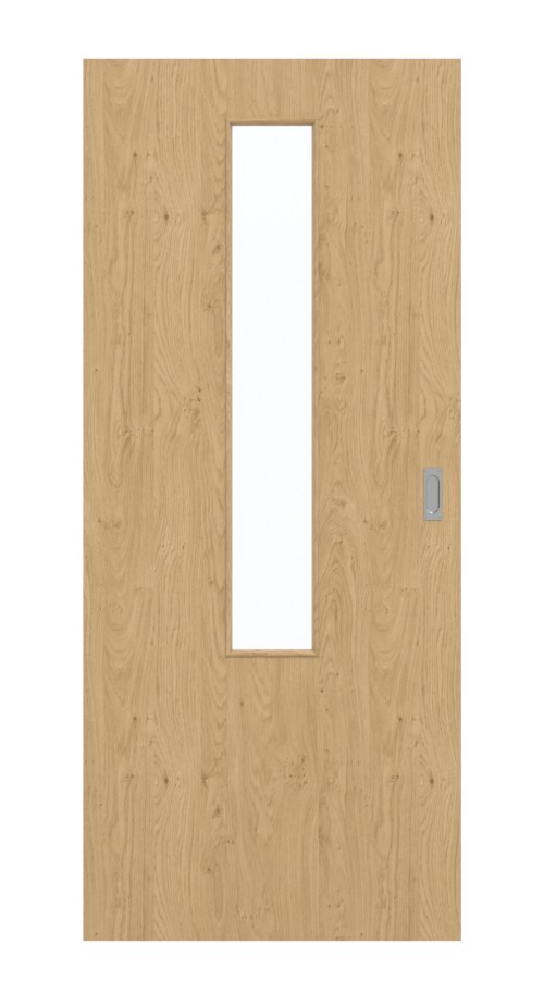 Podłużny otwór świetlny w górnej części skrzydła drzwi tworzy przyjazną atmosferę w pomieszczeniu. Wyraźne usłojenia i sęki stanowią charakterystyczny element wzornictwa drzwi przesuwnych. Rustykalny dekor dębowy urzeka swoim naturalnym wyglądem. Przyjemne odcienie brązu dopełniają całości. Odporna na światło warstwa wierzchnia HPL wykazuje się wyjątkową wytrzymałością.