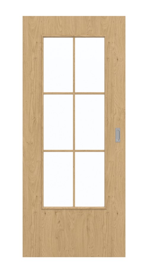 Przeszklenie w środkowej części drzwi zapewnia jasność i przyjazną atmosferę w wnętrzach. Nałożona rama szprosowa dzieli ją optycznie na sześć pól. Wyraziste usłojenia i delikatne sęki sprawiają, że drzwi przesuwne przyciągają wzrok. Rustykalny dekor dębowy urzeka swoim naturalnym wyglądem. Naturalne odcienie brązu dopełniają ten projekt. Powierzchnia HPL okazuje się niezwykle wytrzymała i odporna na wysoką temperaturę.