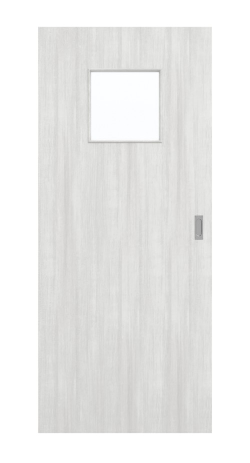 Kwadratowe okno świetlne, znajdujące się w górnej części skrzydła drzwi, zapewnia jasne otoczenie mieszkalne. Model drzwi przesuwanych w szarej okleinie drewnianej nadaje wnętrzu modny akcent. Delikatne cienie tworzą pionowe usłojenia na skrzydle drzwi. Model zachwyca swoim chłodnym urokiem. Wierzchnia warstwa wykonana z HPL jest niezwykle odporna na światło, ciepło i zużycie mechaniczne.