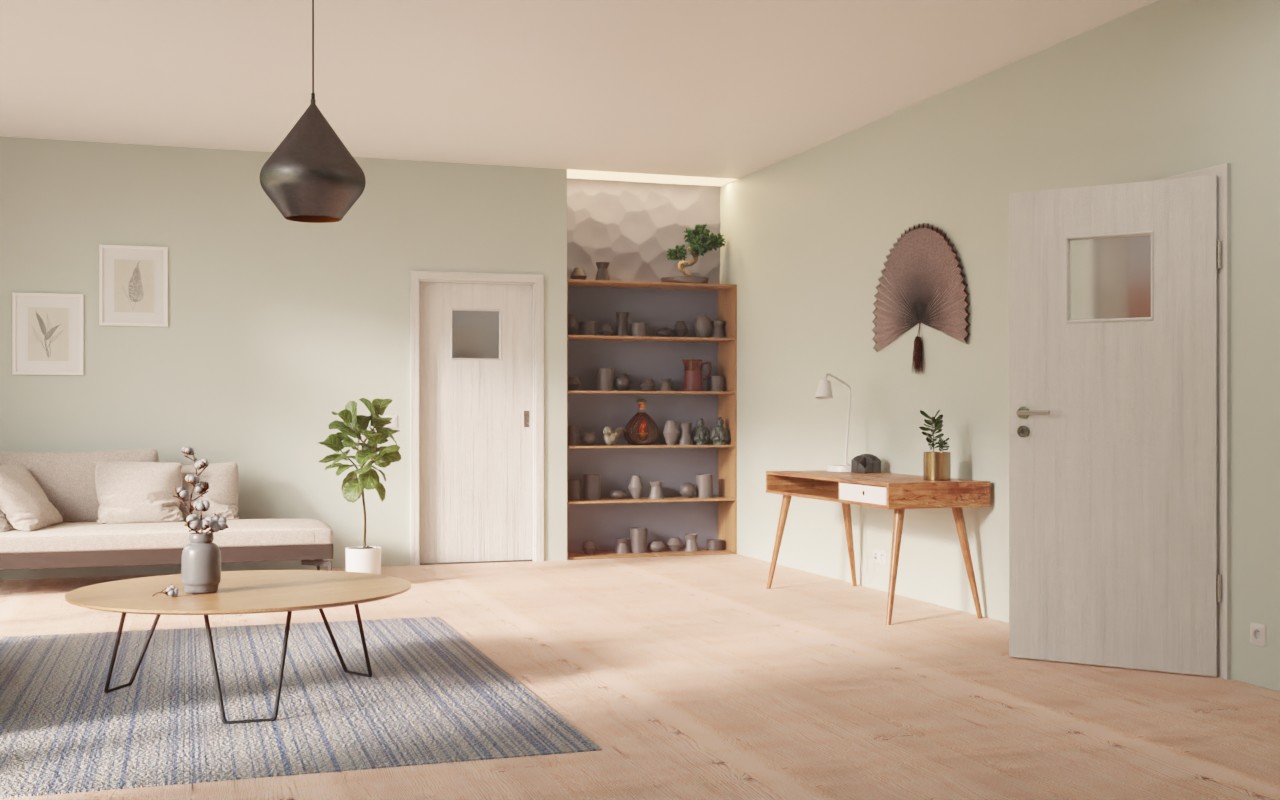 Środkowy rdzeń drzwi stanowi płyta wiórowa. Jest klasyfikowana w grupie obciążeniowej M. Dlatego te drzwi mogą być stosowane zarówno w biurze, jak i w pomieszczeniach prywatnych. W zestawie znajduje się również kwadratowa muszla uchwytowa oraz prowadnica podłogowa.